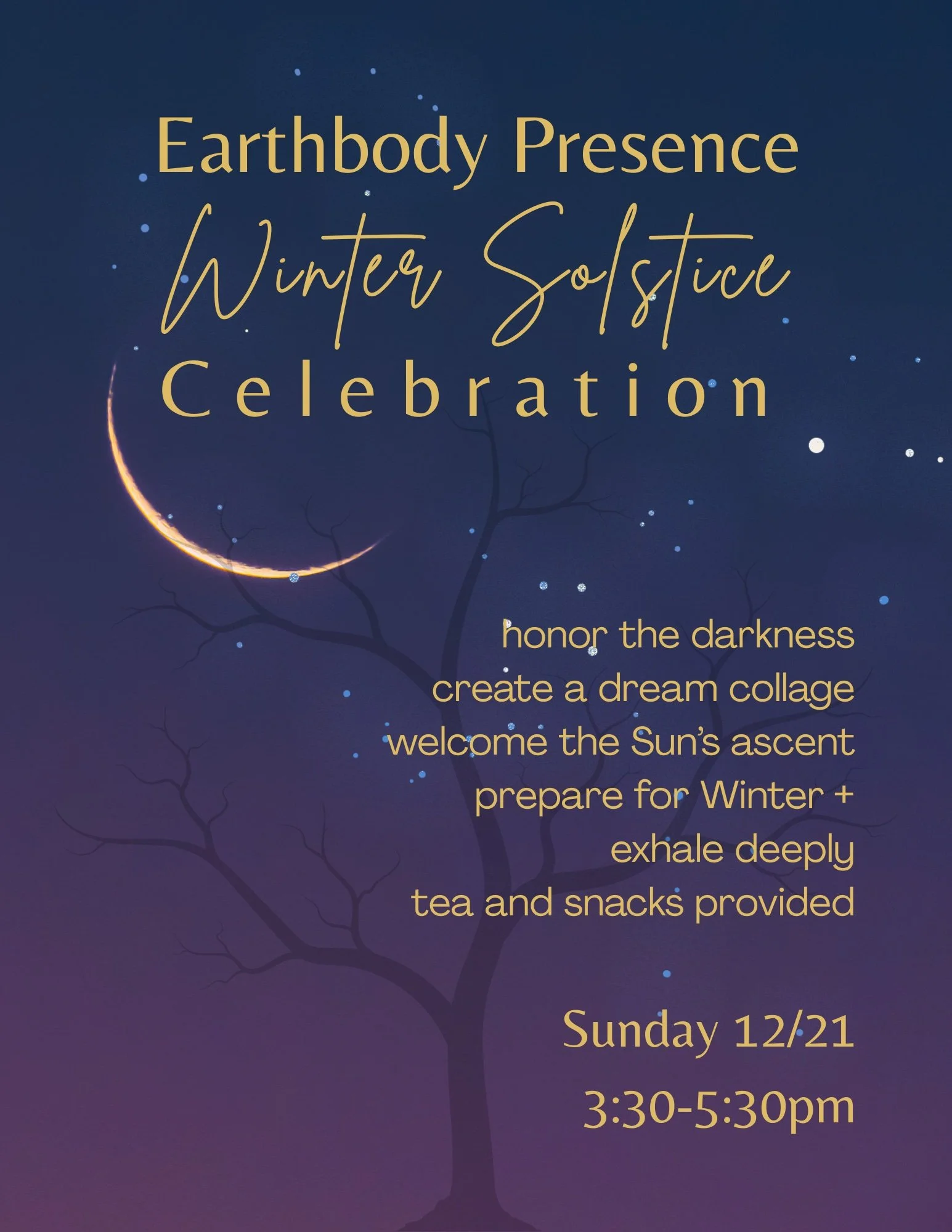 Usher in the return of the light with Earthbody Presence! Join us for grounding, movement, creative exploration, and meditation practices.